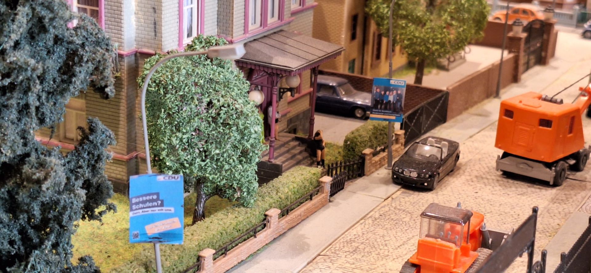 Wer die Bilder sieht, erkennt sofort: Das ist nicht einfach „ein paar Plakate“. Das ist ein kompletter Wahlkampf-Mikrokosmos. Auf Kopfsteinpflaster rollen Käfer, Coupés und ein gelber Flitzer an der Plakatreihe vorbei. An anderer Stelle rückt schweres Gerät an – Bagger, Raupe, Baustellenfahrzeug. Und auch das passt erstaunlich gut zur Realität: Wenn irgendwo Wahlkampf ist, ist nie weit entfernt auch eine Baustelle. Im Modell ist sie immerhin pünktlich, ordentlich abgegrenzt – und die Wahlwerbung hängt trotzdem.